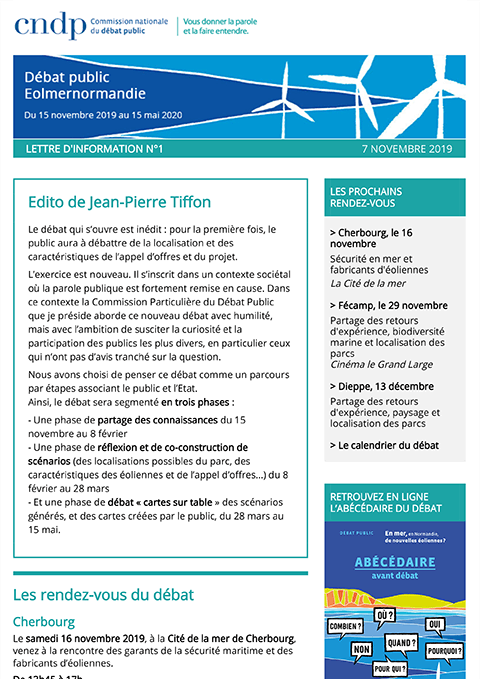 Rendez-vous le 16 novembre à Cherbourg pour le premier événement du débat, à la rencontre des garants de la sécurité maritime et des fabricants d'éoliennes à la Cité de la Mer.