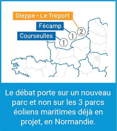Du 15 novembre 2019 au 19 août 2020*, le débat public « En mer, en Normandie, de nouvelles éoliennes ? » porte sur le futur appel d’offres de l’Etat, pour la construction d’un parc éolien au large des côtes normandes.