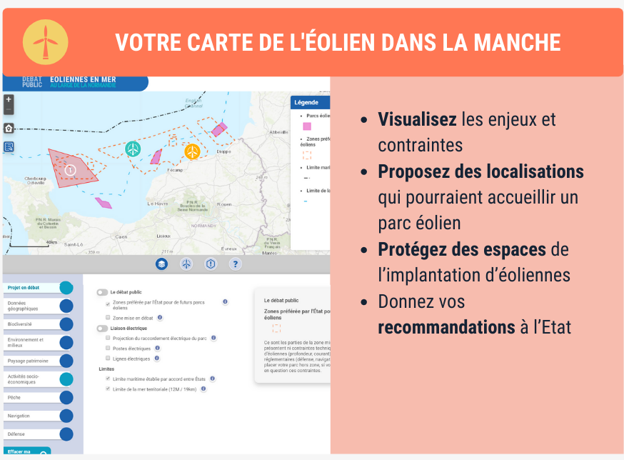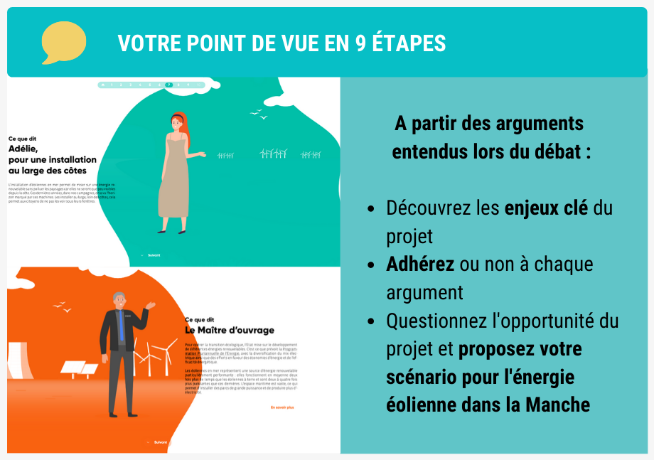 Conçu à partir des arguments du maître d’ouvrage ainsi que ceux entendus au cours du débat lors des réunions publiques, cet outil en ligne permettait à chacun de se forger son propre point de vue sur les éoliennes en mer et de communiquer son avis sur les grands enjeux de l’éolien ainsi que son avenir dans la Manche.
