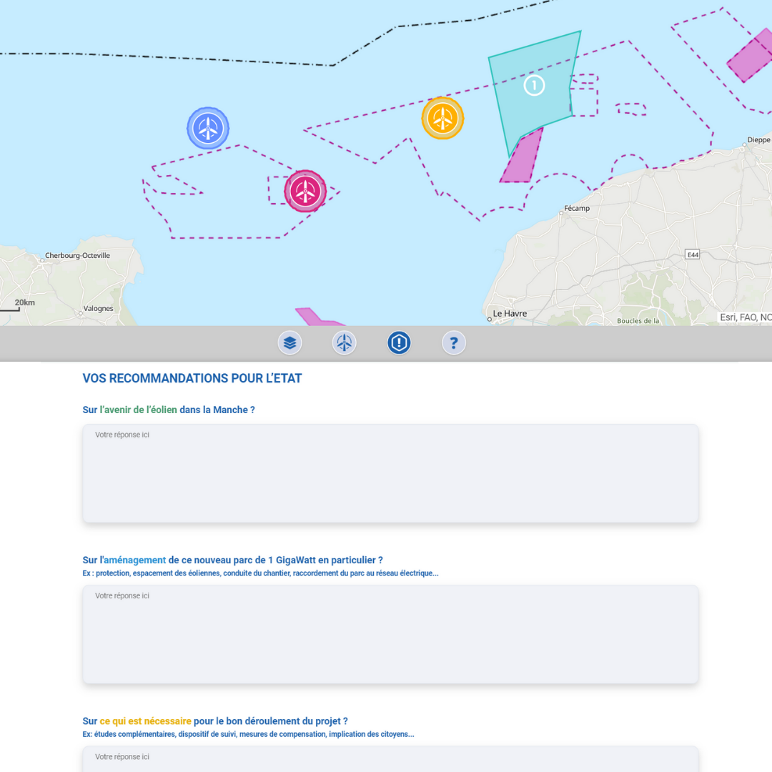 Objectif : Permettre aux publics de cartographier leur avis, individuellement et en ligne. Recueillir des recommandations et permettre de localiser des emplacements qui pourraient accueillir un ou plusieurs futurs parcs éoliens, mais aussi de protéger des espaces des éoliennes et expliquer ses choix.